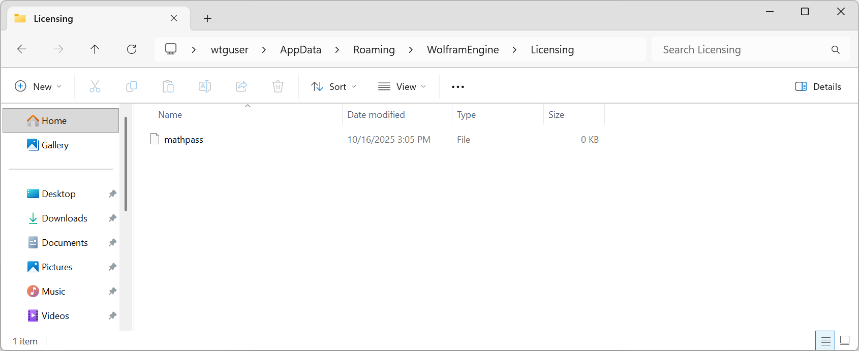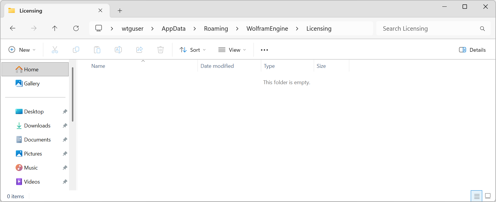 - Open a file explorer and browse to C:\Users\user\AppData\Roaming\WolframEngine\Licensing.