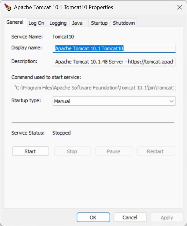 - In the Start Menu under Apache Tomcat, open the Configure Tomcat application.