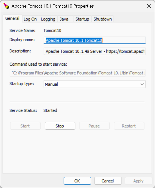 - In the Configure Tomcat application, make sure the Service Status shows “Started”.
