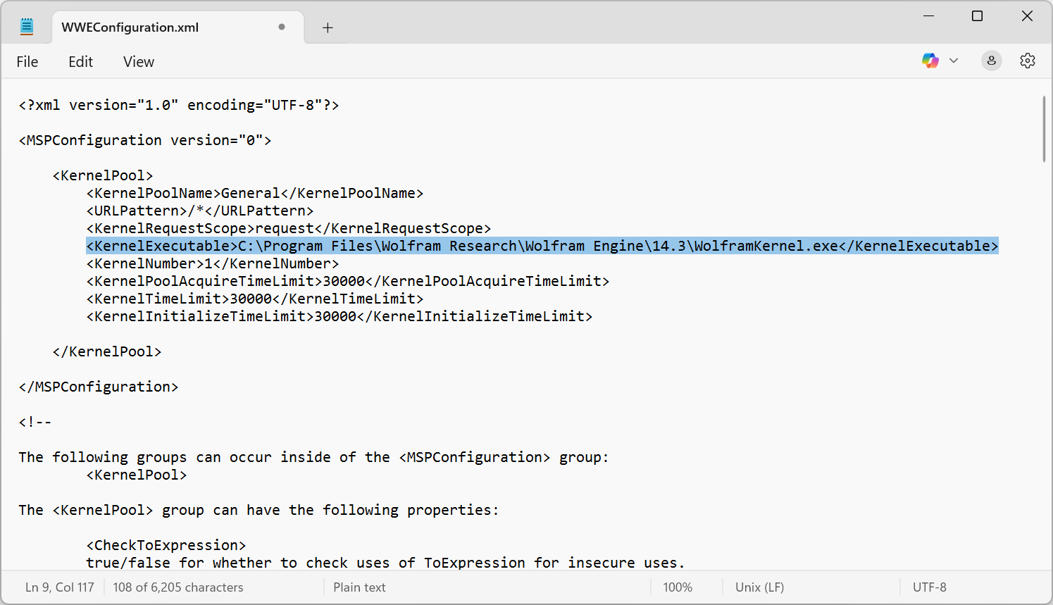- In the KernelExecutable property, enter the path to the Wolfram Engine kernel executable file. We recommend using “C:\Program Files\Wolfram Research\Wolfram Engine\14.3\WolframKernel.exe”.
