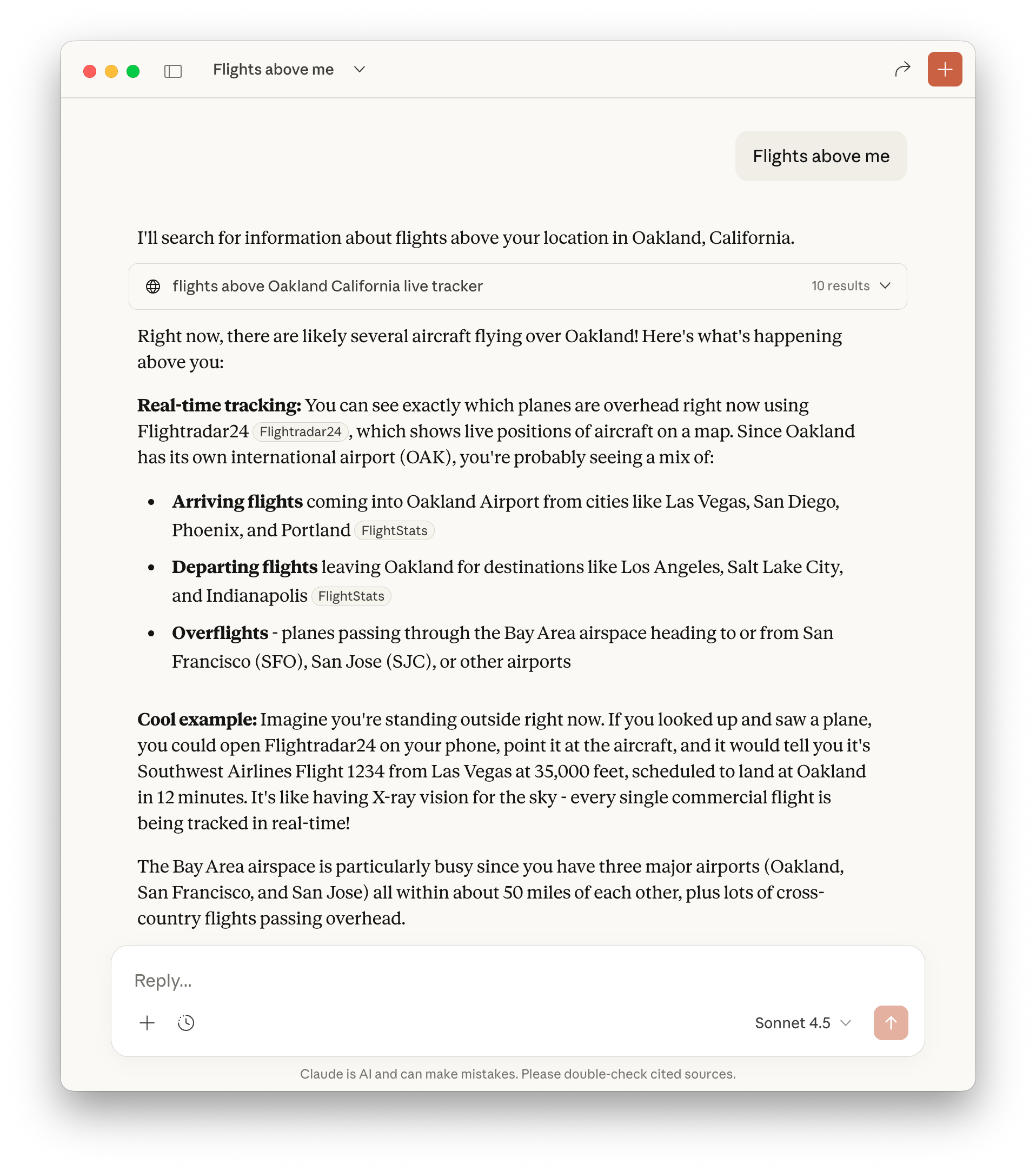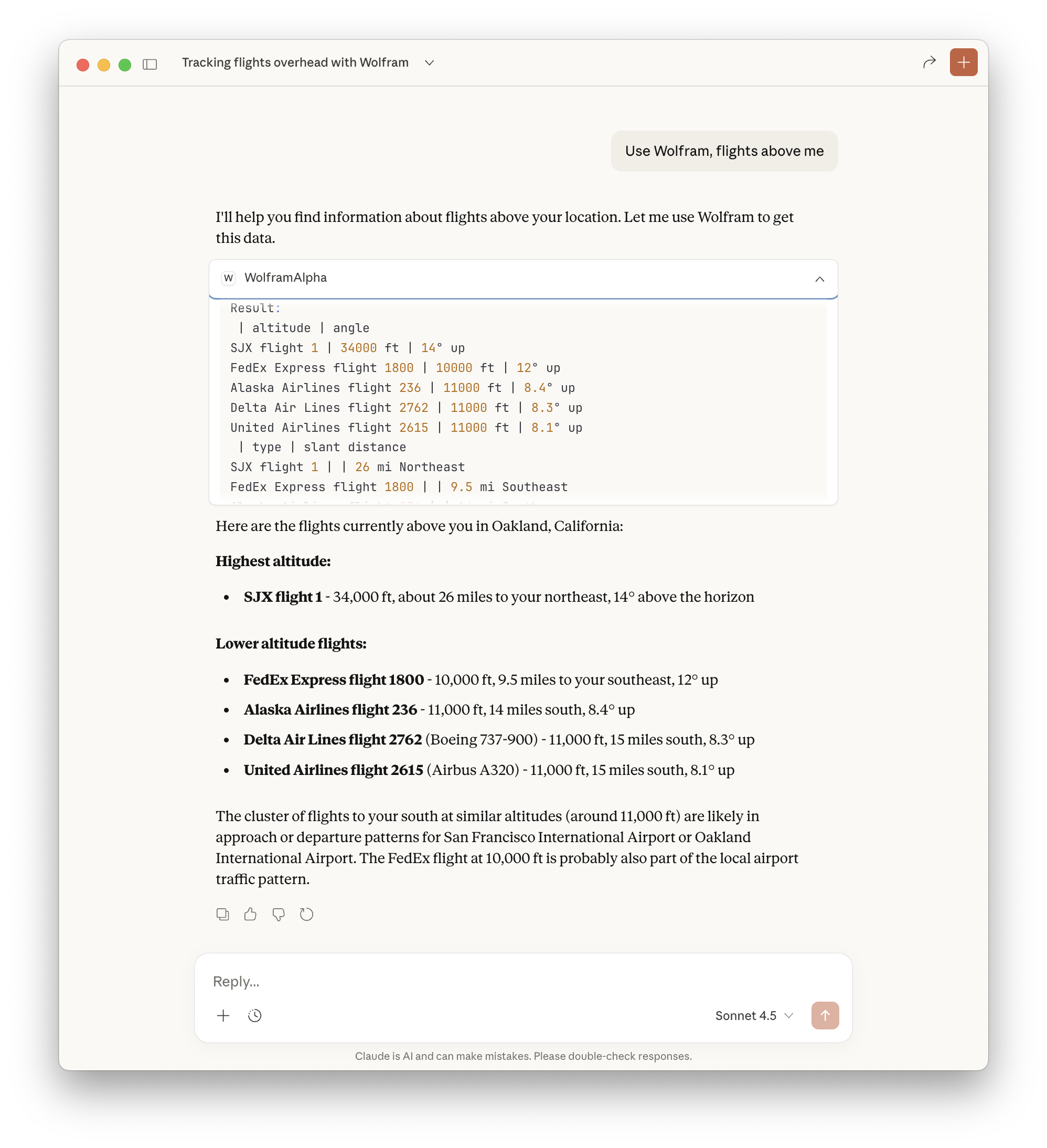 Querying “Flights above me” with Wolfram MCP Service: